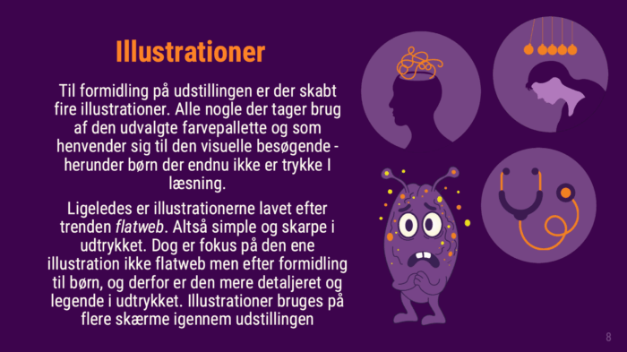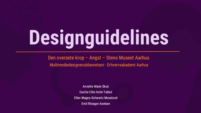 Som eksamensprojekt på multimediedesignuddannelsens 2. semester udviklede min studiegruppe og jeg en digital prototype til Steno Museets udstilling Den Oversete Krop. Løsningen havde fokus på temaet angst, og målet var at gøre det komplekse emne mere tilgængeligt og forståeligt for børn i alderen 6–13 år. I alt blev der produceret fire forskellige interaktive skærme, som var tænkt til at indgå i museets udstilling. De er udviklet med HTML, CSS og JavaScript, men selve processen frem mod de færdige produkter omfattede en bred vifte af faglige områder som research og idéudvikling, UX/UI-design, grafisk identitet, interaktivt design og tests. Prototypen kombinerer storytelling, illustrationer, interaktive elementer og lyd for at skabe en immersive experience – sanselig og lærerig oplevelse, der supplerer museets fysiske udstilling.
